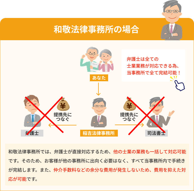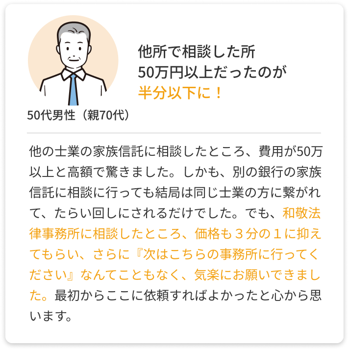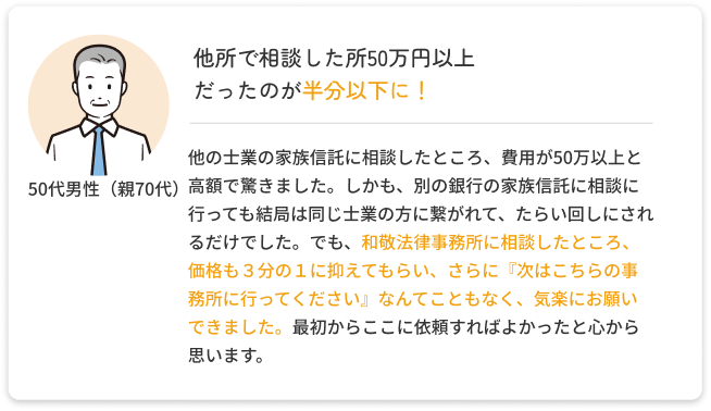 和敬法律事務所は、「弱い立場の人を守る」という理念のもと活動しています。 だからこそ、他所で一度相談したものの、50万円以上の費用に諦めてしまった方にも、良心的な価格で、安心してご依頼いただけるサービスを提供しています。